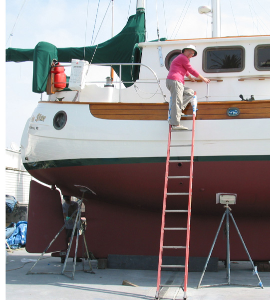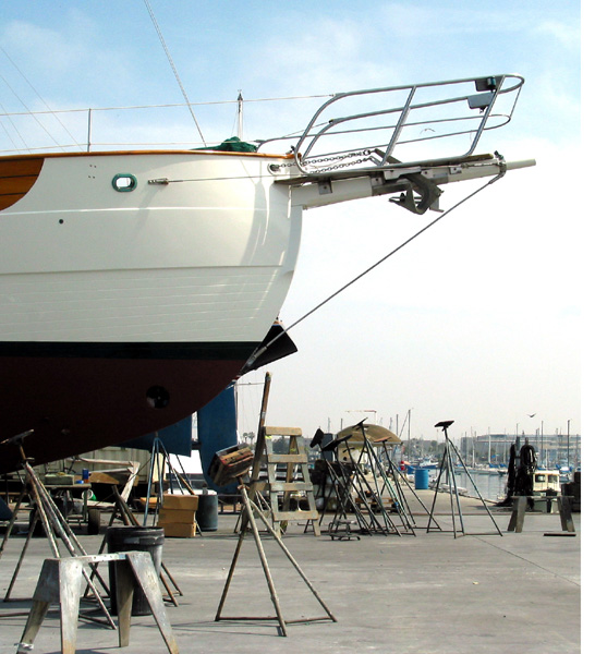 If you've been following our updates, you may be thinking, "they were going to leave in April, what happened?" Well, difficulty with one little project turned into 5 weeks in the boat yard having work done on the boat. In March while I was in Michigan, Gary was having a new wind transducer installed on top of the mast; however the existing wiring didn't cooperate and it was decided that we would need to pull the mast to accomplish our goal. Now that wasn't too bad as we already intended to have the boat pulled (taken out of the water) and the bottom repainted, so we could pull the mast at the same time. Soooooo we moved the boat to a boat yard on Shelter Island, near downtown San Diego and work began..and Gary's mind started working overtime. If the mast was coming down, it was probably a good time to replace the rigging (the wires, etc. that hold up the mast), and since we were doing that, we might just as well paint the mast too! So a 24 hour job turned into 3 ½ weeks in the yard. For 3 of those days, the boat was sitting on a cradle and we had to climb a 10' ladder to get on & off the boat and we couldn't use any water. The rest of the time, we were tied up next to the 150 ton hoist that started working at 7:30 a.m. everyday. Finally when the work was completed we started off to our marina only to discover black smoke coming out of the exhaust! So we turned around and went back to the boatyard. It was discovered that due to a closed valve, sea water had been sucked into the engine and contaminated the oil..this all involved 7 more days at the boatyard and multiple oil changes. But the boat is now in tip-top shape and ready to go exploring!